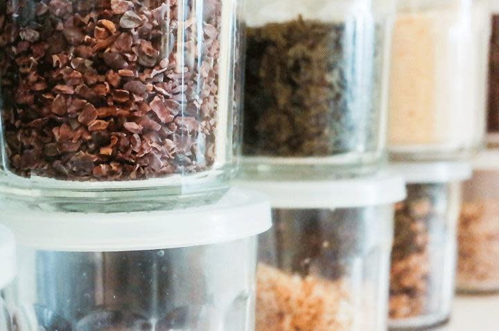 I de små krukkene har hun alt fra salt til tørket rabarbra, nøtter og rå kakao. Alt er tørrvarer som holder seg bedre under lokk.