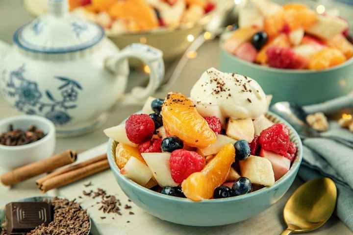 Fruktsalat med julekrydder og hjemmelaget råkrem