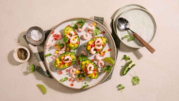 Grillet avokado med mangosalsa og reker