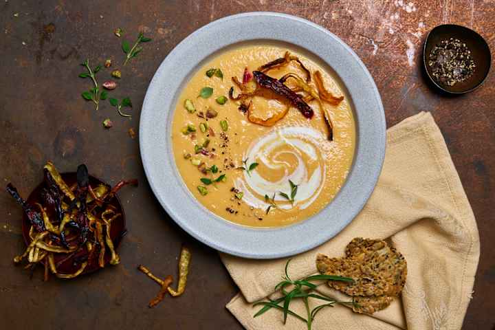 Grønnsakssuppe med rotgrønnsaker og urteknekkebrød