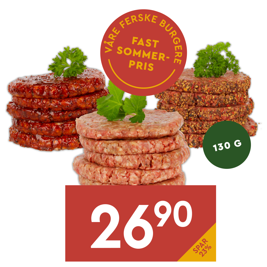 Den ferske steakburgeren vår på 130 gram er et supergodt alternativ. Du får den i tre varianter. Naturell kan du krydre som du selv vil. Krydret steakburger har en fin krydderrand som både ser kul ut og gir ekstra smak. Marinert steakburger er penslet med en akkurat passe spicy og deilig marinade. Hva med å prøve alle tre.