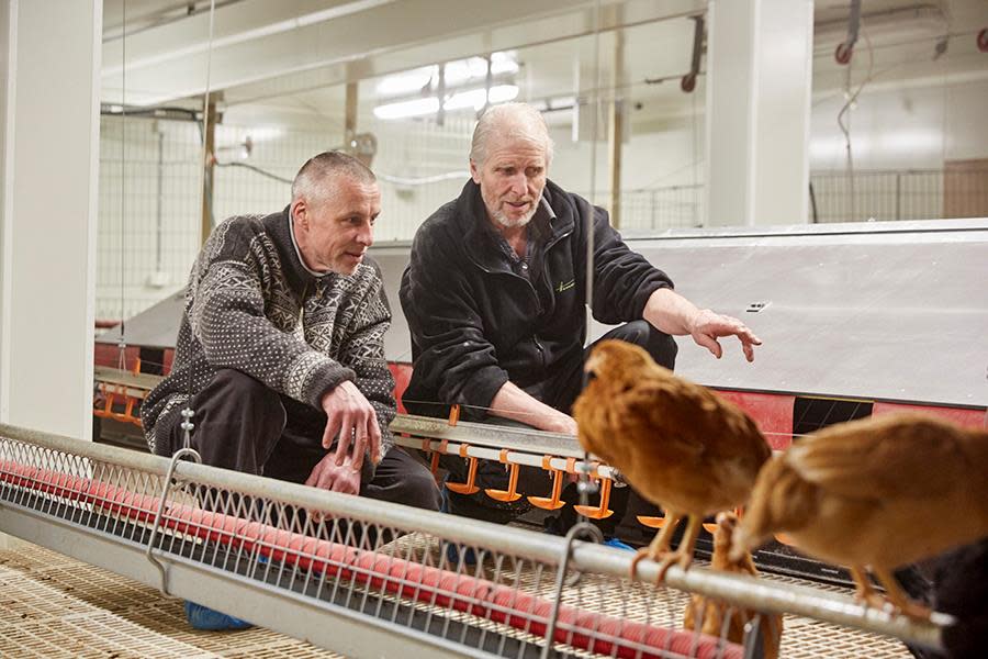 Jarle Johansen og Bjørn Brynjolf Pedersen inspiserer det nye hønsehuset. Den nye hønserasen er aktiv og glad i å være ute. I sommerhalvåret kan de selv bestemme om de vil være ute heller inne.