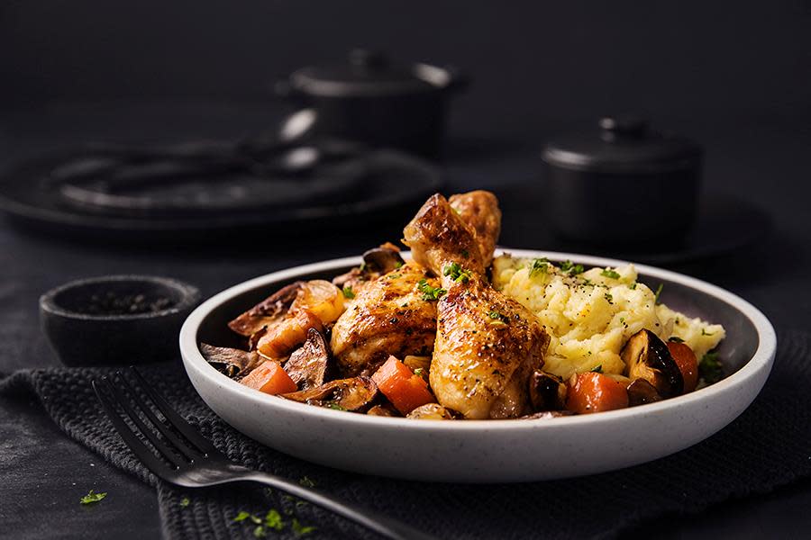 Vi har latt oss inspirere av den klassiske retten Coq au vin, som rett og slett betyr hane i vin. Det har tradisjonelt blitt brukt hane eller høne, men de fleste moderne oppskriftene bruker kylling.