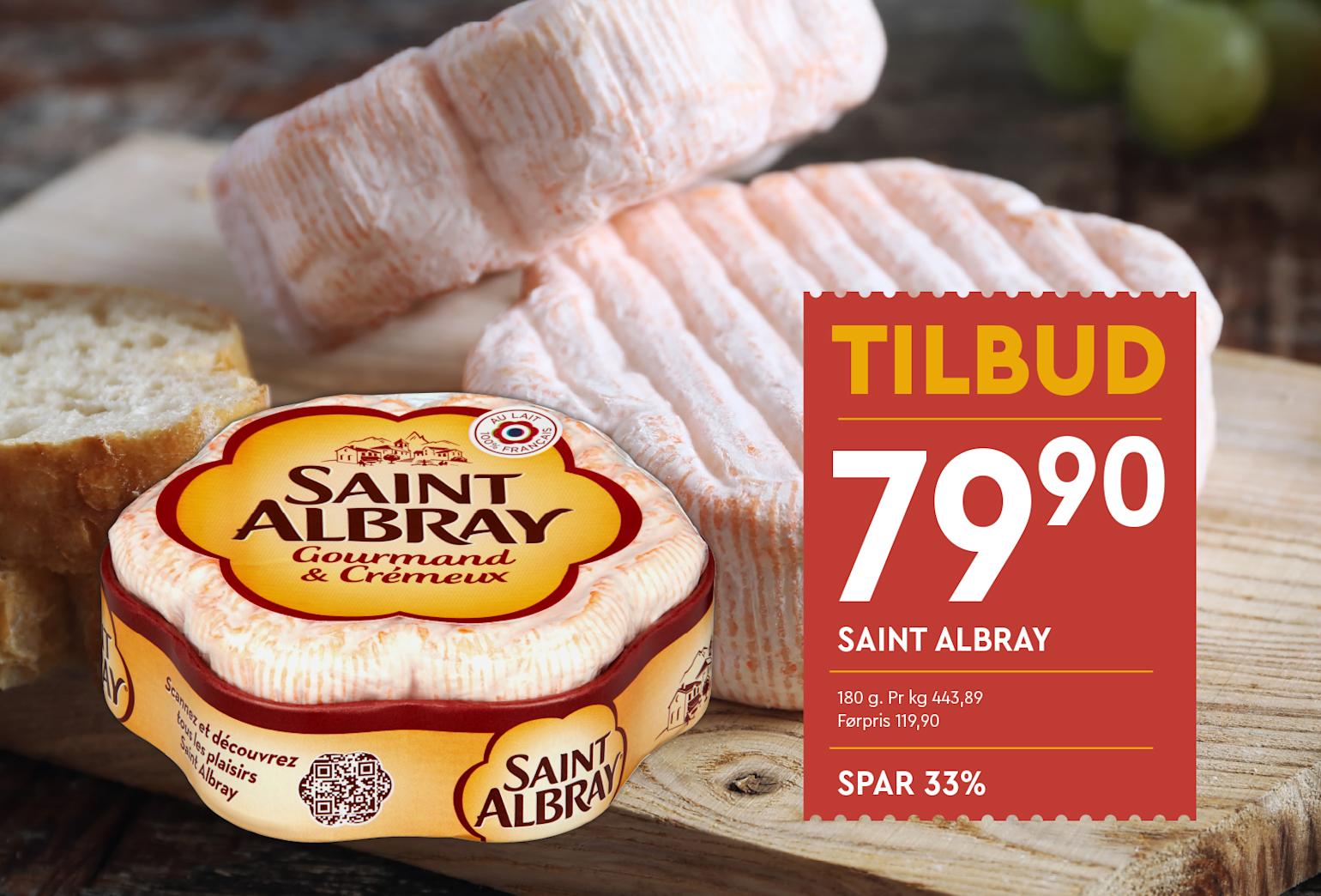 Saint Albray er en typisk dessertost med glatt konsistens og en mild, nøtteaktig smak. Den passer godt til både vin, frukt og kjeks, og er perfekt til ostefatet - også på grunn av sin karakteristiske dekorative prestekrageform.