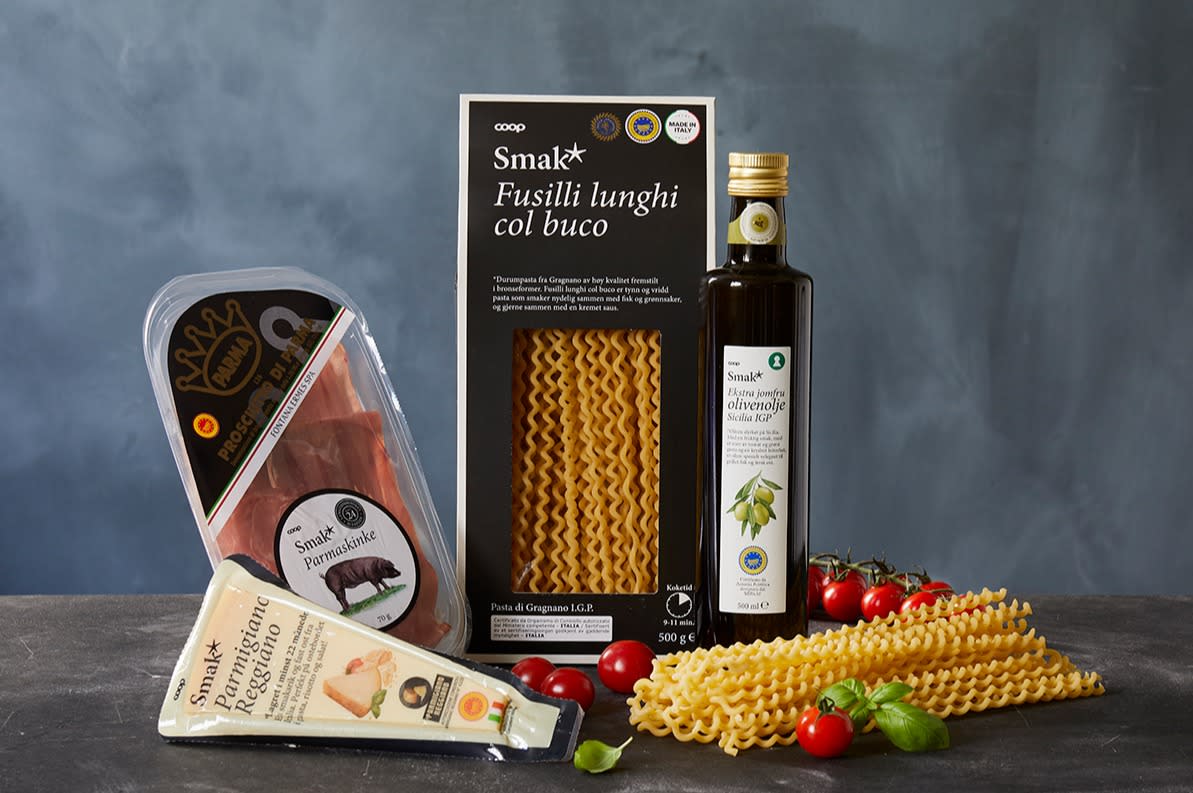 Lag gjerne en gavepakke med en av de mange kvalitetsproduktene fra Smak*. Sett sammen for eksempel en pasta, en pesto eller olivenolje, en fyldig ost og litt spekeskinke.
