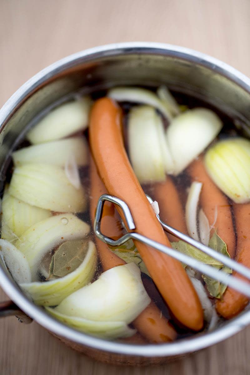 Pølsene skal trekke i vann, ikke koke. Slik unngår du at de sprekker.