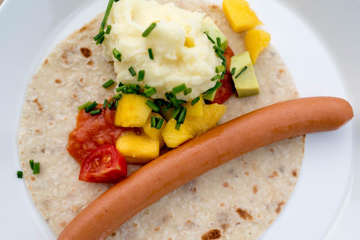 - Prøv oppkuttet mango, avokado, hjemmelaget potetmos og hjemmelaget ketchup sammen med wienerpølsa i lompe. Kjempegodt!