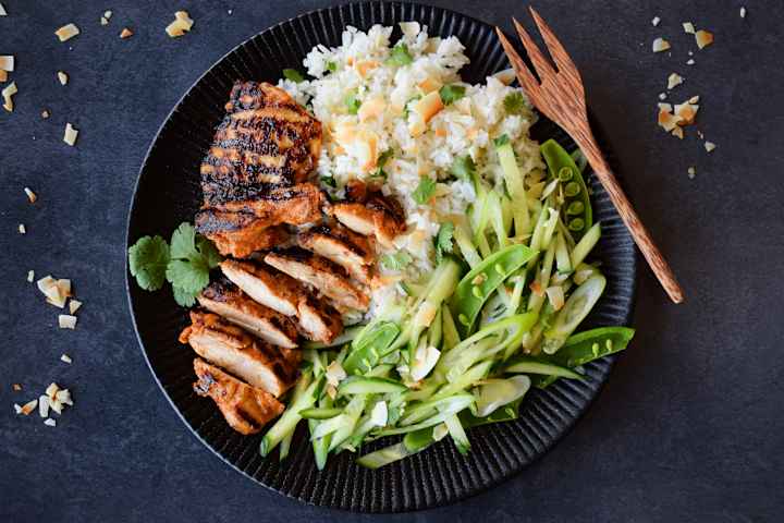 Grillet red curry kylling med korianderris og agurksalat