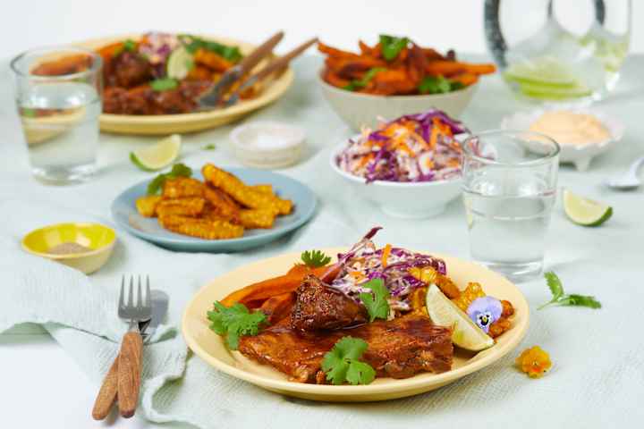 Baby Back Ribs med søtpotetfries, coleslaw og cornribs