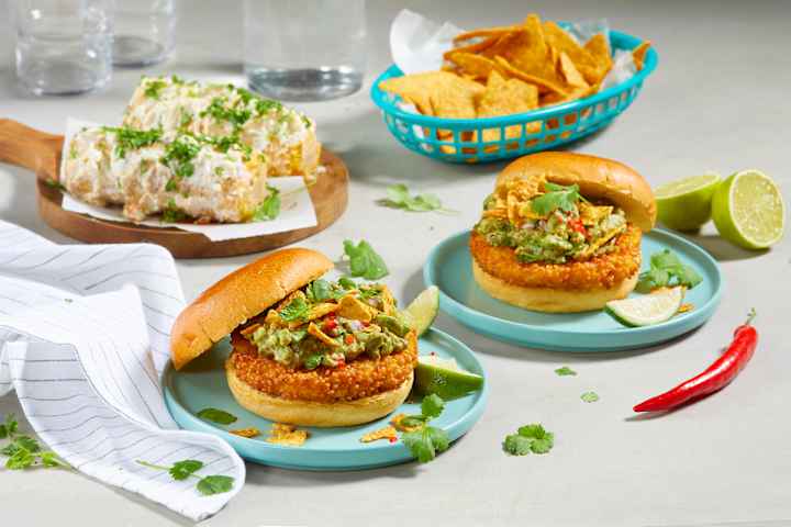 Crispy kyllingburger med spicy guacamole og meksikansk street corn