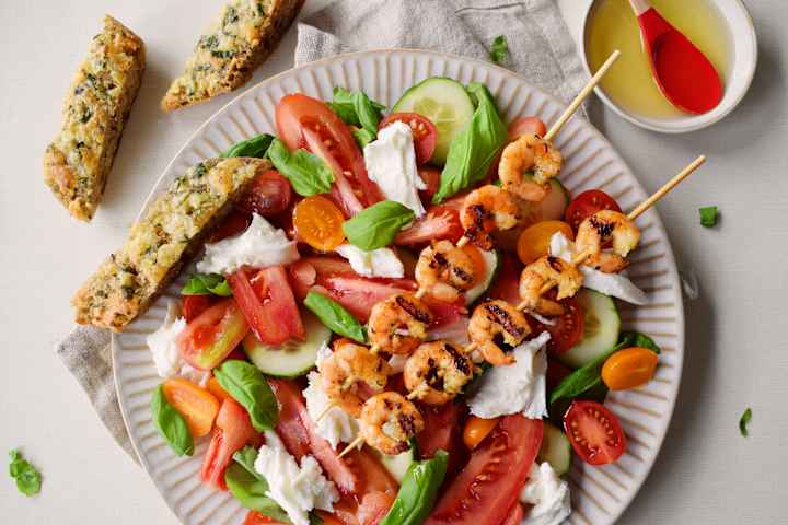 Italiensk sommersalat med grillet scampi og hjemmelaget hvitløksbrød