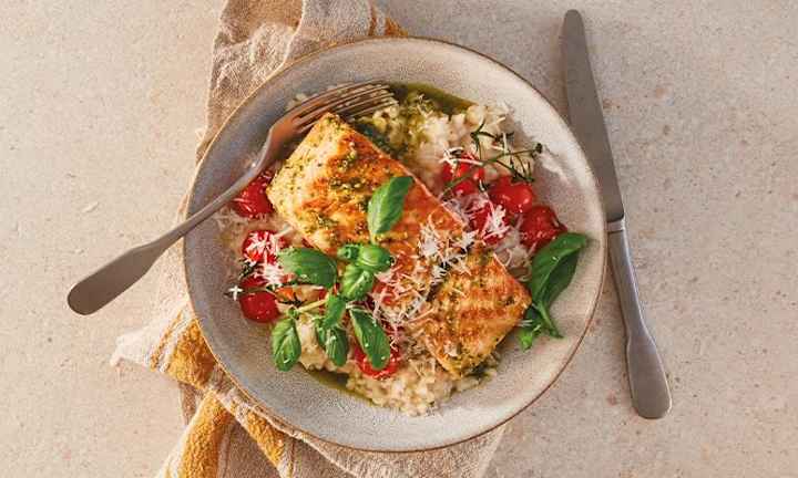 Laks med pesto, hjemmelaget sitronrisotto og bakte tomater