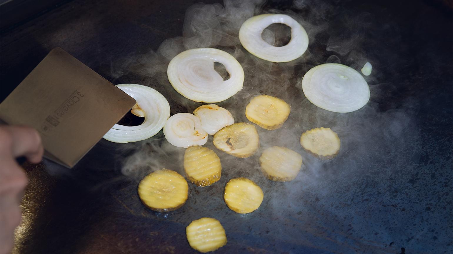 – Ved å grille løk og sylteagurk på høy varme, kun på en side, får man en god stekeskorpe som gir en lignende smak som en smashburger gir. Denne litt forkullede smaken er en viktig del av vår smaksprofil, og gir retten en tydelig identitet, sier han.