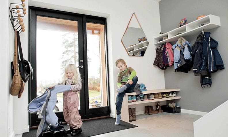 - Innenfor ytterdøren i gangen vår har barna plass til å ta av støvlene og regnbuksen på den store, sorte gummimatten. Knaggene under hattehyllen rekker de fint opp til og får hengt av seg jakkene uten hjelp fra voksne. Trenger de å sette seg ned for å knyte skoen, kan de hvile seg på benken som også fungerer som skohylle.