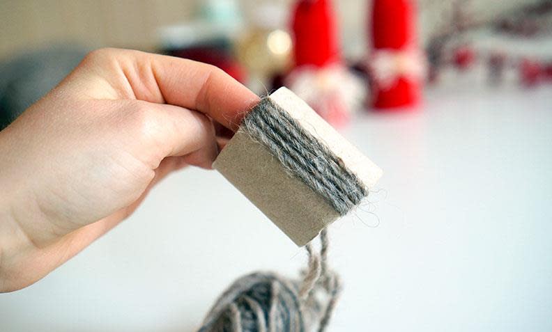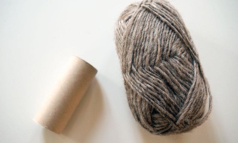 3. Lag et lite nøste av litt av garnet - nøstet må være lite nok til at det kommer gjennom hullet av rullen. Surr trådene forsiktig rundt og rundt slik at de ligger tett som på bildet over.