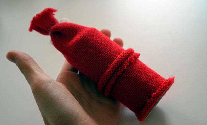 3. Lim strømpen på dorullen som på bildet over. Pass på at «antrekket» og luen møter hverandre på midten så all dorullen er skjult.