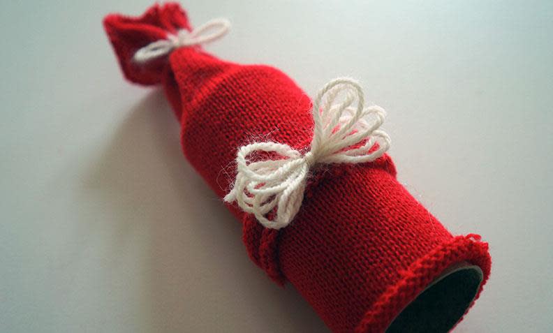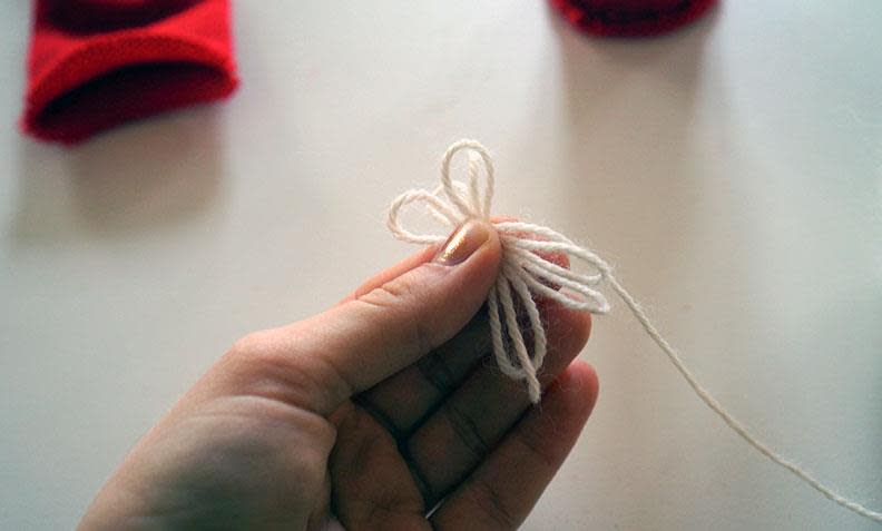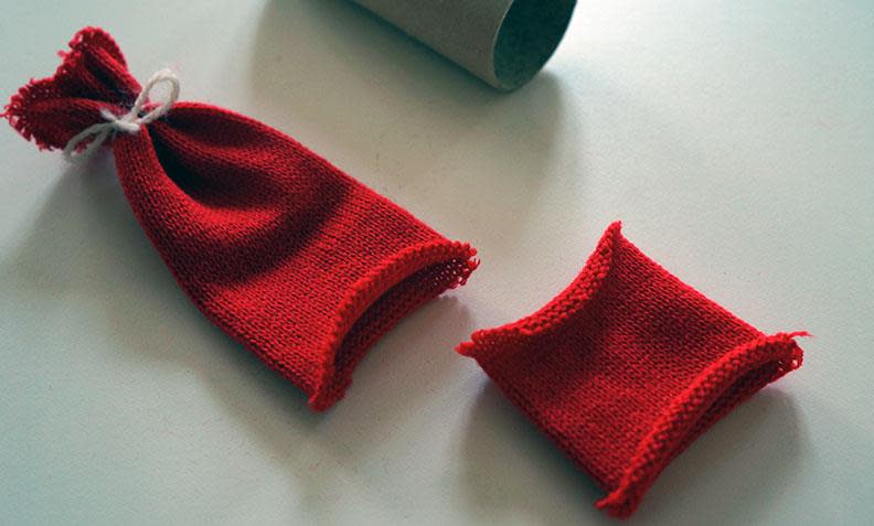 2. Mål hvor mye av den røde strømpen du trenger ved å træ den på dorullen. Legg til noen centimeter ekstra til nisseluen, knyt igjen med litt hvitt garn, og klipp av.