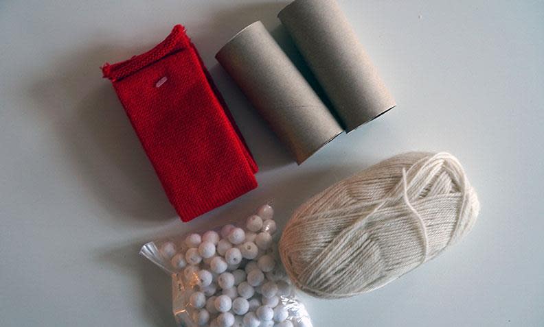 1. Til disse dorullnissene trenger du: To doruller, litt hvitt garn, rød hobbystrømpe, små kuler, flytende lim og litt maling.