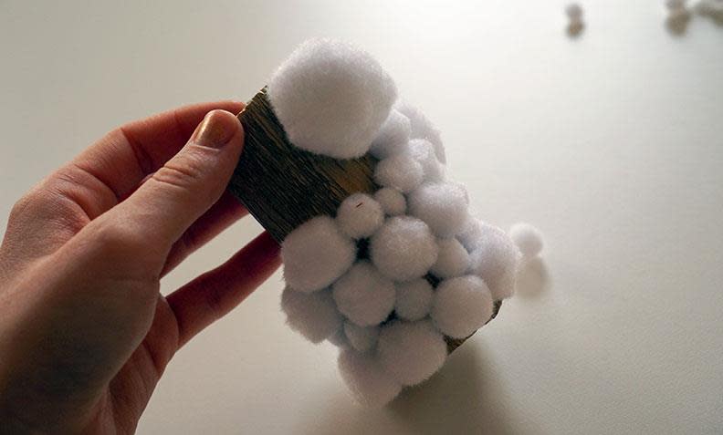 3. Lim de hvite pompoms-ene på i ønsket mønster. Vi har limt dem på litt tilfeldig for at det skal se ut som en «ekte» snølykt. Etterfyll med små pompoms der du ser papiret godt gjennom.
