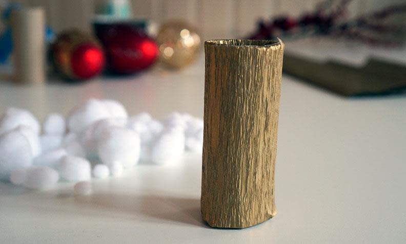 2. Lim papiret utenpå dorullen, og brett papiret på oversiden inn i dorullen. Undersiden skal være tett, så brett papiret her som på enden av en gave og lim fast. Dette skal uansett dekkes, så det er ingen krise hvis det ikke blir perfekt.