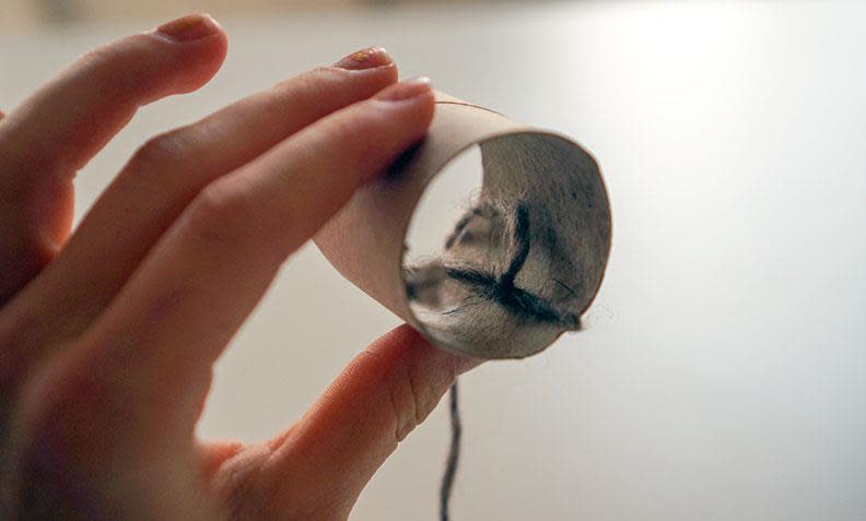 2. Klipp den halve tørkerullen forsiktig i to, og finklipp kantene så de blir like store. Knyt deretter tråden som på bildet over - en stram knute på innsiden av dorullen. Pass på at endetråden har litt lengde, siden denne skal brukes til å knyte den andre enden fast senere.