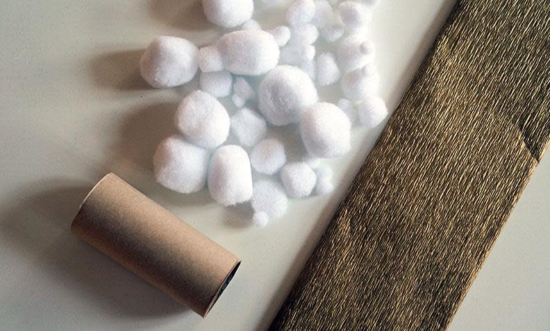 1. Til snølyktvasen trenger du: En dorull, kreppapir (eller annet papir) i ønsket farge, masse små pompoms, flytende lim.