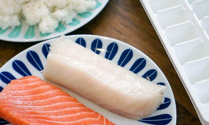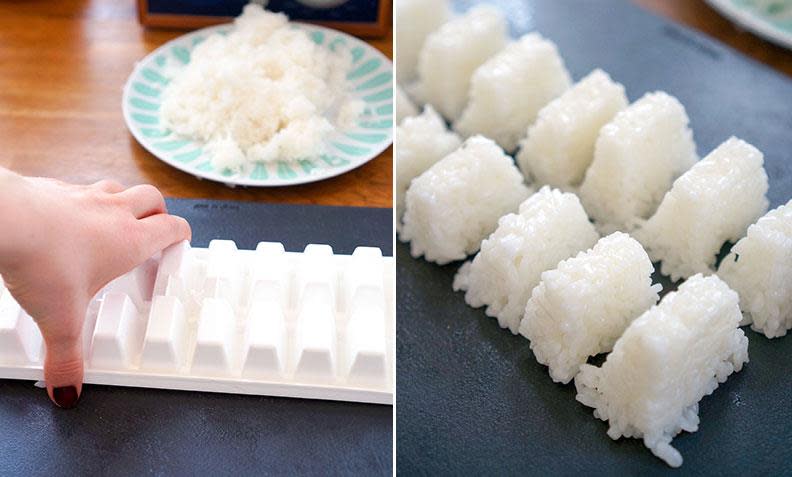 Isbitform-trikset under gjør nemlig formingen av selve risklumpene til en lek. Ved å fylle isbitformene med kokt sushiris, lager du tolv sushibiter på like lang tid som det tar å lage én sushibit på vanlig vis.