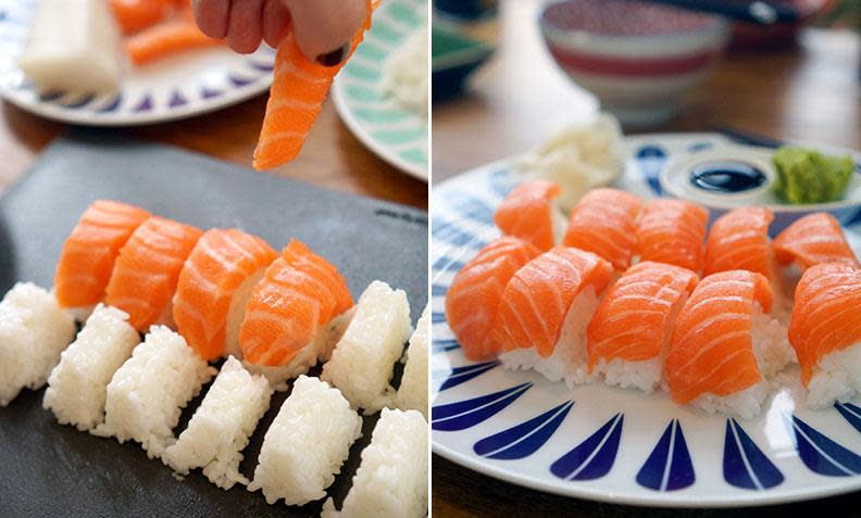 Når risklumpene er ferdig formet, tar det bare noen sekunder å legge fisk på toppen. Og vips, har du 12 (eller 24, eller 36...) nigiri klare til å spises.