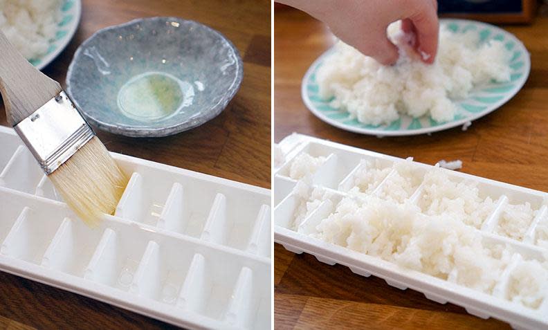 Smør et tynt lag olje i isbitformen. Dette er for å gjøre det enklere å få ut risen etterpå. Fyll hvert avlukke i isbitformen med omlag én spiseskje sushiris. Press risen med et lett trykk, slik at den samler seg i isbitformen.