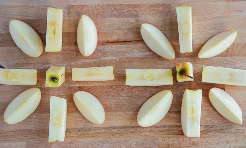 Ikke start med å skjære eplet over midten, slik du kanskje pleier, men til siden for kjernehuset.