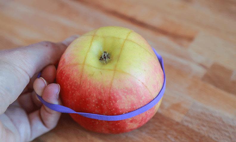 Fest en strikk rundt eplet for å holde eplebitene samlet, og voilá! Du har et eple som vil holde seg friskt lenge i matpakken.