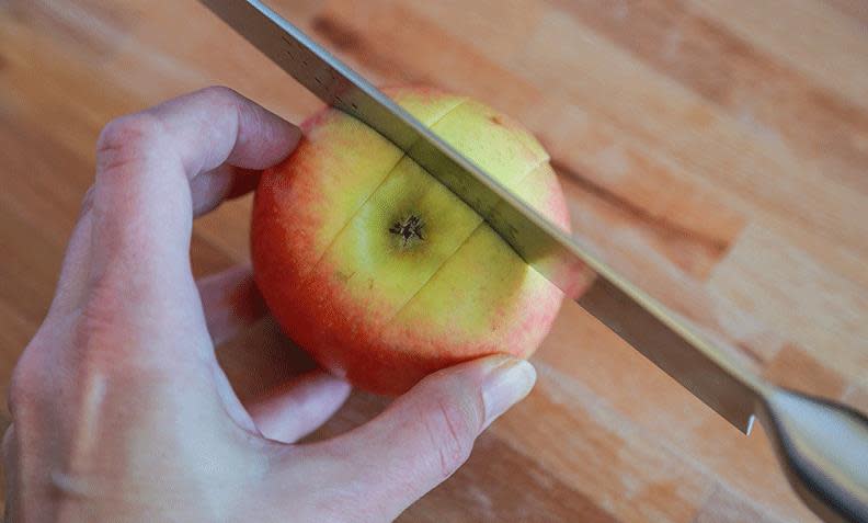 Snu eplet opp ned slik at det står støtt, og du har full kontroll under kuttingen.