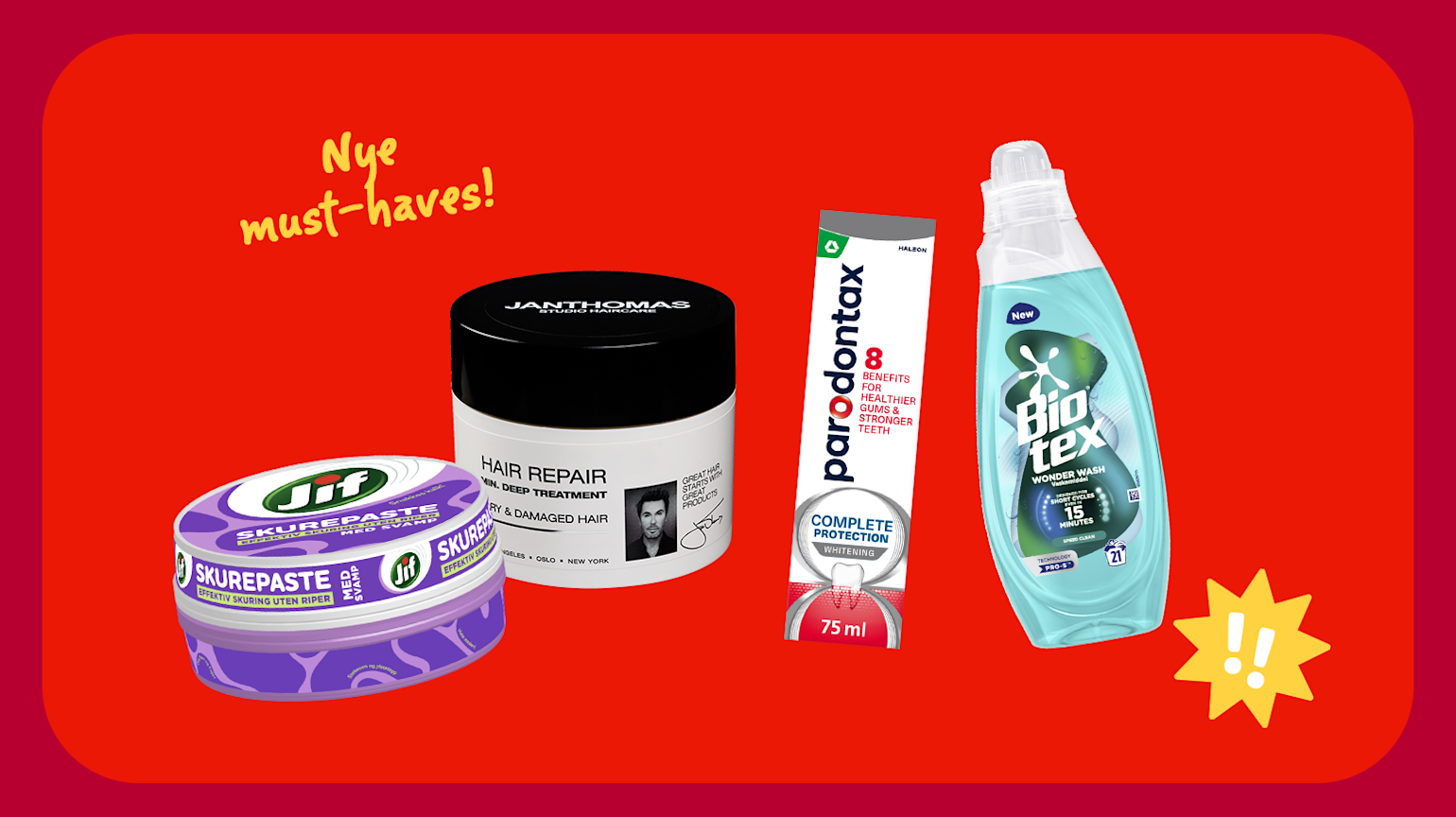 Ikke alle nyheter havner på middagsbordet, men de er minst like nyttige i hverdagen. Jif skurepaste med svamp lover effektiv skuring uten riper, enten det er platetopp, stekeovn, fuger eller hvite sneakers som trenger en oppfriskning. Biotex Flytende Speed Clean er laget for korte vaskesykluser og vasker rent selv på programmer helt ned i 15 minutter. Til badehylla finner Jan Thomas Hair Repair Mask, en hårmaske spesielt utviklet for å reparere og styrke tørt og skadet hår. Og til tennene har vi nyheten Parodontax tannkrem Complete Protect, en tannkrem med åtte fordeler for sunnere tannkjøtt, sterkere tenner og skånsom whitening-effekt.