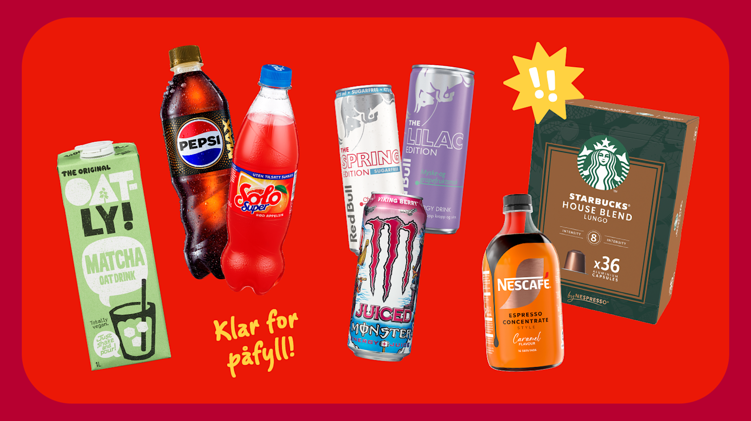 For deg som vil ha noe ekstra oppkvikkende finner du Red Bull Spring Edition, Red Bull Lilac Edition med smak av myske- og grapefrukt og Monster Juiced Viking Berry. Vil du ikke ha koffein, kan vi tipse om Pepsi Max koffeinfri med den samme gode smaken som klassikeren – og den friske og fruktige nyheten Solo Super Rød Appelsin, helt uten sukker.