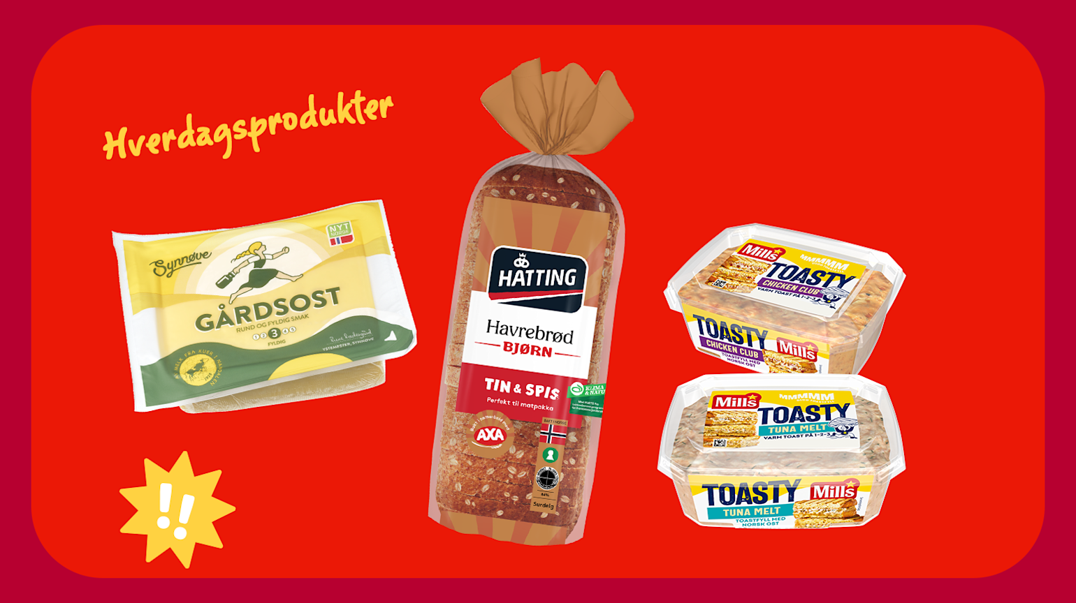 Til brødskiva kommer nå Synnøve Gårdsost i enda større pakning, og vi gleder oss også til å teste Mills Toasty, en ny serie med smaksrike toastfyll med revet norsk ost. Smør fyllet mellom to brødskiver, varm i toastjernet og du har digg toast på 1-2-3. Og når vi først er inne på brød: Hatting havrebrød Bjørn finner du i frysedisken. Tin og spis når det passer, så har du alltid ferskt brød tilgjengelig. Brødet er bakt med Axa Bjørn havregryn og surdeig, og har full score på grovhetsskalaen.