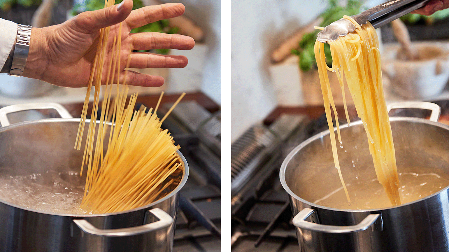 Stivelsen i vannet gjør underverker for sausen – den blir jevnere, fyldigere og får en silkemyk konsistens. Bruk en kjøkkenklype eller hullsleiv til å løfte pastaen direkte over i sausen i pannen. Tilsett litt og litt pasta- vann og vend inn til du får den konsistensen du ønsker.