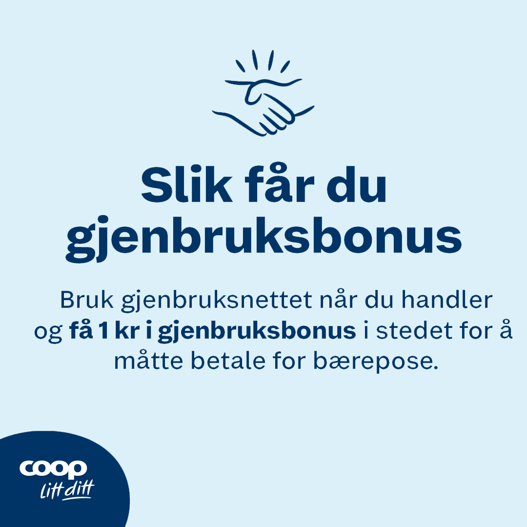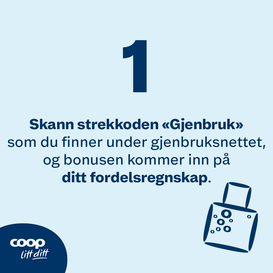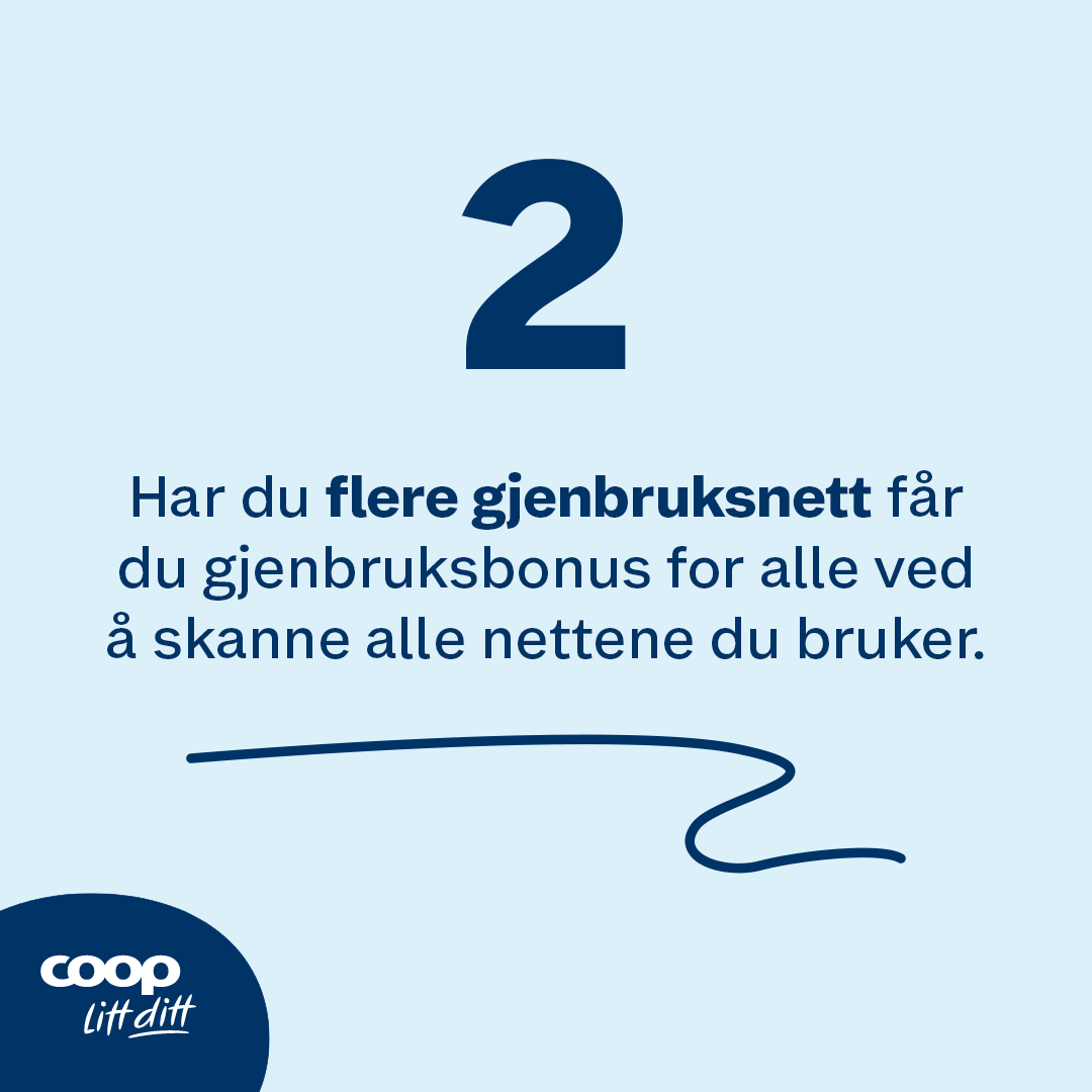 Du vil få gjenbruksbonus for antall gjenbruksnett du trenger til dine varer, ved skanne alle gjenbruksnettene du har fyllt. Har du behov for flere gjenbruksnett, eller har du ikke et slikt gjenbruksnett kan det kjøpes i din Coop-butikk.