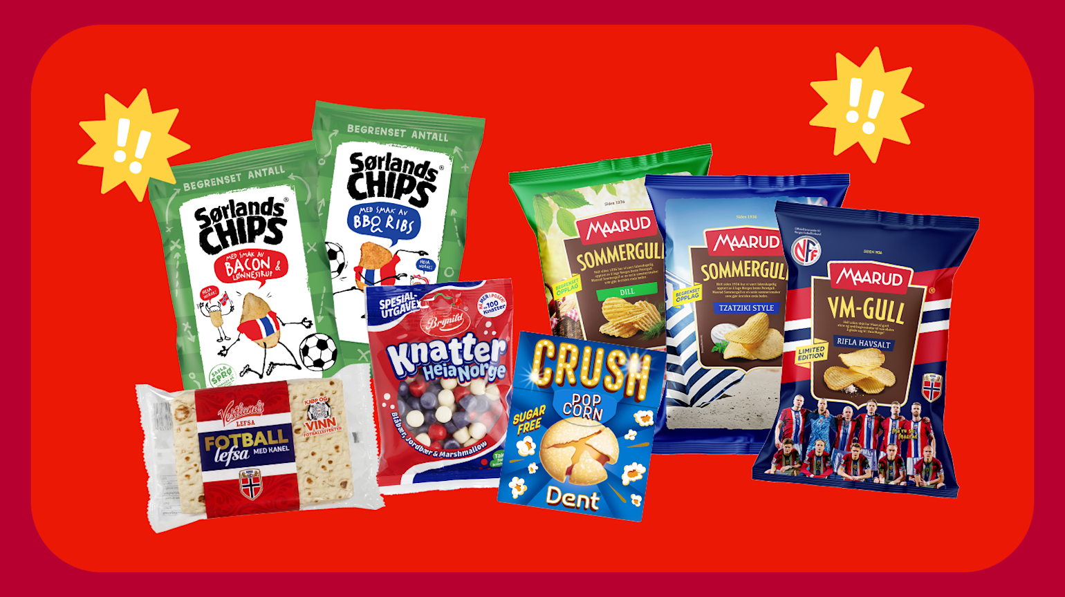 Potetgull er også et must til fotballkampen, og både Maarud og Sørlandschips har sørget for at du har flere spennende smaker å knaske på mens landslaget konkurrerer i fotball-VM. Maarud VM Gull Rifla Havsalt, Sørlandschips BBQ Ribs og Sørlandschips Bacon & Lønnesirup er alle laget i begrenset antall og spesielt for fotball-VM. Disse må du med andre ord slå kloa i mens du kan!