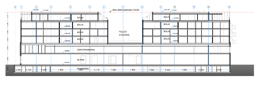 Næringslokaler 2500 kvm for utleie i de 2 nederste etasjer og 39 leiligheter i 4 etasjer.