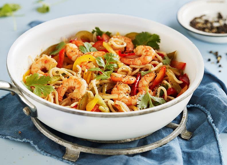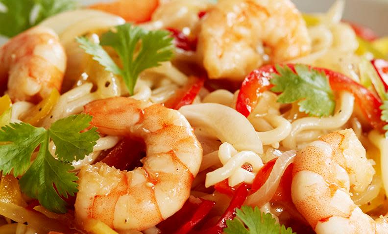Wok med scampi freser du sammen på få minutter. Med ferdigkokte nudler har du stjernemiddag på et kvarter. Gull i hverdagen!