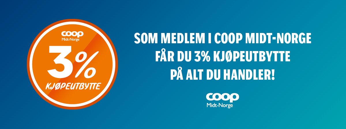 Coop Midt-Norge er en av landsdelens største bedrifter, med en omsetning på ca. 8,7 milliarder kroner i 2023 fra 131 butikker i 28 kommuner. Vi er stolte av at vi er at samvirkelag, som innebærer at vi eies av medlemmene våre. Coop Midt-Norge er eid av ca. 275.000 medlemmer, som hvert år kan nyte godt av en rekke medlemsfordeler og 3% kjøpeutbytte*.