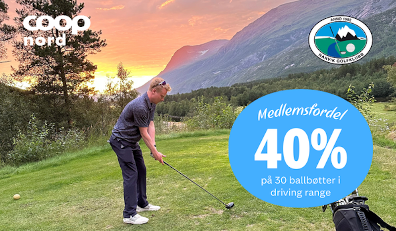 Som medlem får du 40 % rabatt på 30 ball-bøtter i driving range hos Narvik Golfklubb. Medlemspris 450 kr (ordinær pris 750 kr). I tillegg får du 500 kroner i rabatt for Veien til golf-kurs.