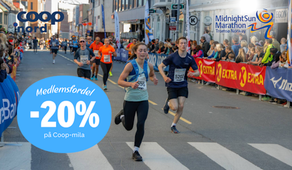 Få 20% rabatt på Coop-mila (10 km) under Midnight Sun Marathon 20. juni. Bli med på ditt livs løpseventyr!