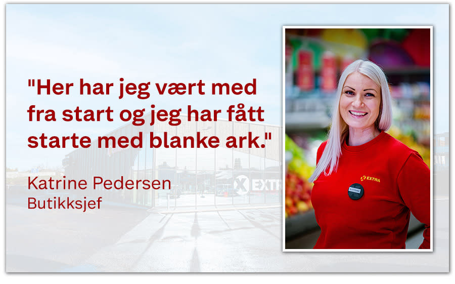 Jeg har jobbet i Coop i 15 år, startet i meieriavdelingen på Obs Sørlandssenteret som 16 åring, og ble etter hvert ansvarlig for brød- og meieriavdelingen. I 2014 ble jeg tørrvaresjef, der jeg hadde det totale ansvaret for avdelingen og de 10 ansatte som jobbet i den. Jeg bestemte meg for å flytte østover til Porsgrunn for å komme nærmere familien. Jobbet ett år som butikksjef på Extra Tjølling, før jeg søkte på jobben som butikksjef på den nye butikken her på Hovenga. Jeg trivdes veldig som butikksjef i Larvik også, men det var en etablert butikk. Her har jeg vært med fra start og jeg har fått starte med blanke ark. Det er veldig gøy, sier Pedersen.