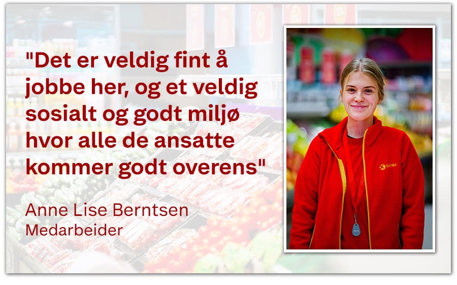 Jeg startet å jobbe her da vi åpnet i oktober og dette er min første jobb i Extra. Det er veldig fint å jobbe her, og et veldig sosialt og godt miljø hvor alle de ansatte kommer godt overens og gjerne tilbringer tid sammen utenfor jobb også. I tillegg liker jeg at butikken er så stor og lys, og at alt er så moderne og lett tilgjengelig.