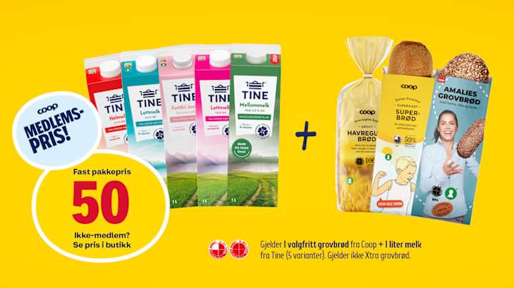 Spiser du et par skiver grovt brød og drikker litt melk hver dag, har du fått i deg mye av det Helsedirektoratet anbefaler som del av et sunt kosthold. Hos Coop Prix får du som Coop-medlem 1 liter melk og 1 grovbrød for bare 50 kroner.