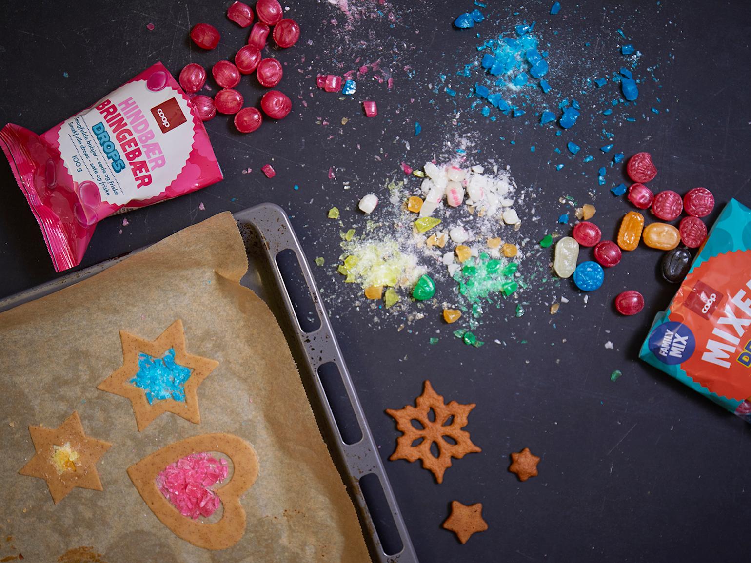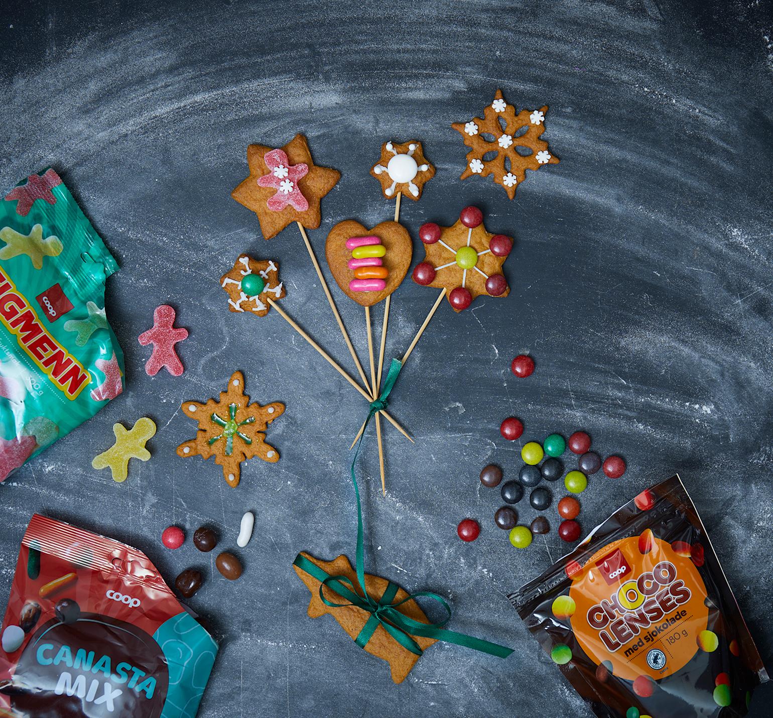 Det er ikke sikkert barna syns det er så gøy med de vanlige pepperkakeformene. Det finnes mange morsomme kakeformer å få kjøpt, men dere kan også skjære ut deres egne. Kanskje har barna en hobby eller en figur fra en TV-serie eller dataspill de heller vil lage. La barna gå berserk med godteri og pynt i ulike farger. Coop har masse fargerikt og morsomt godteri.